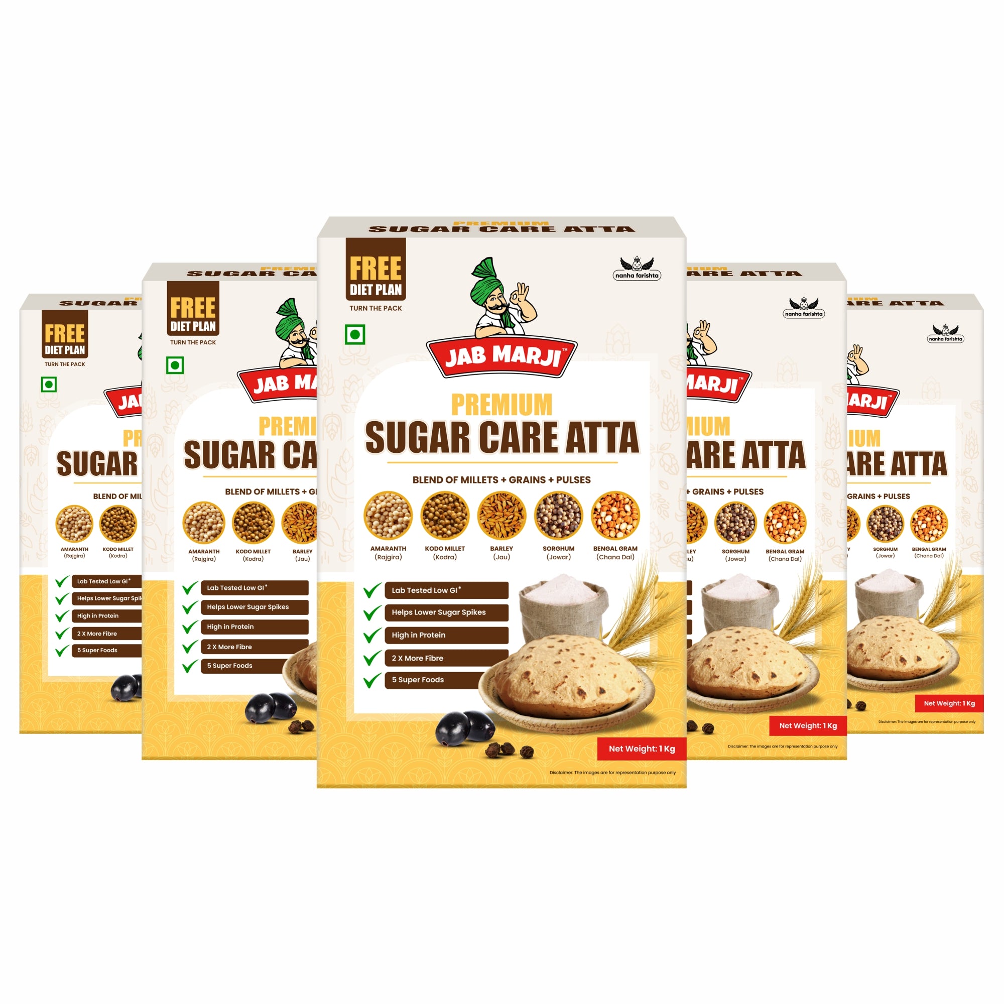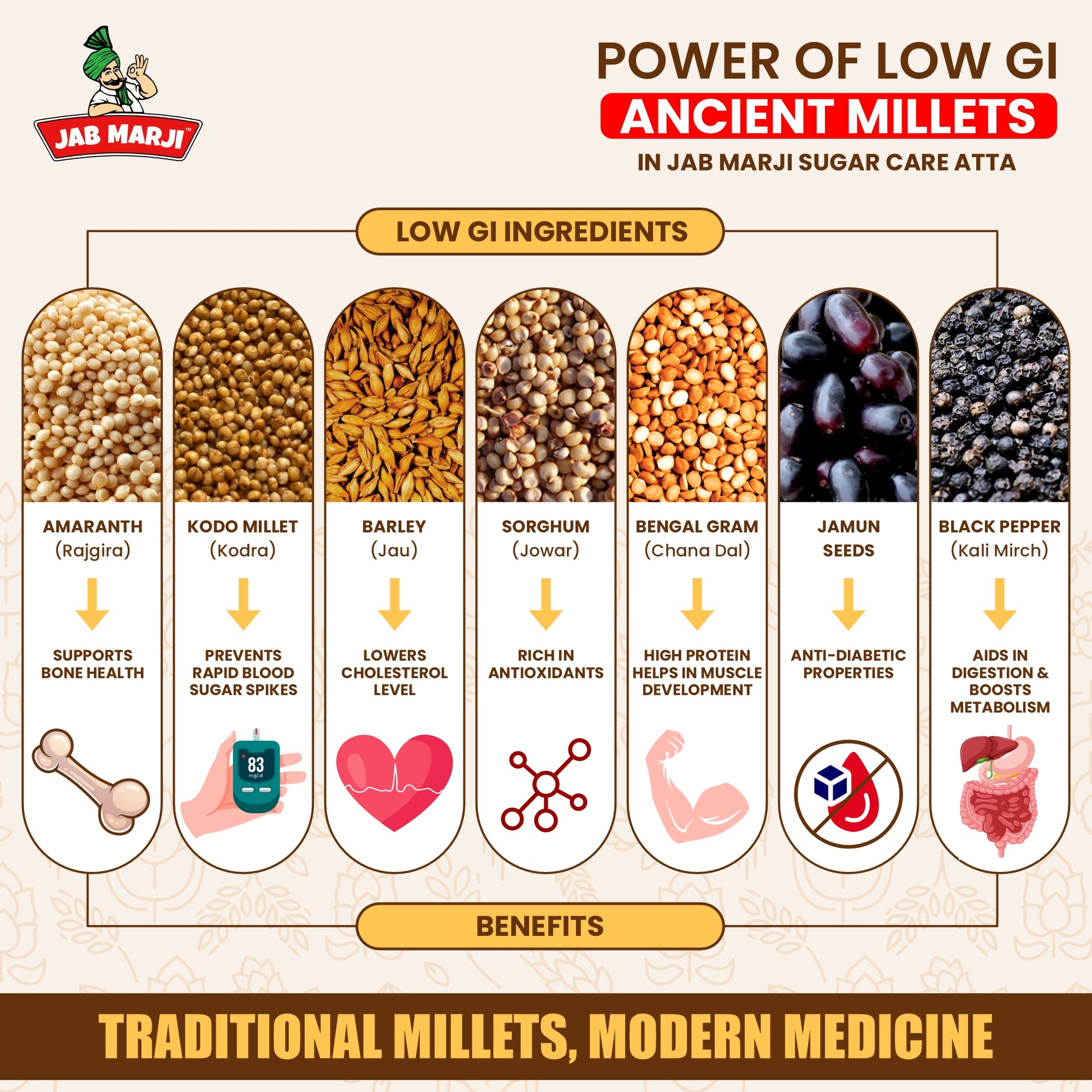 Our Jab Marji Sugar CareAtta (Diabetic Flour- Low GI Multigrain Flour) is crafted with a unique blendof Multigrain Mixture (71.75%) [Barley (Jau), Kodo Millet (Kodra), Sorghum (Jowar), Amaranth (Rajgira), Bengal Gram(Chana Dal), Soy], Wheat (20%), Black Pepper (Kali Mirch), Jamun Seed with alab teste Glycemic Index of 29.